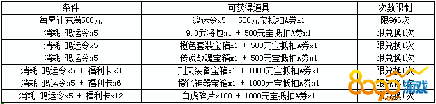 【活动内容】活动期间,每累计充值满500元,即可领取鸿运令x5,且可使用鸿运令兑换精品道具。