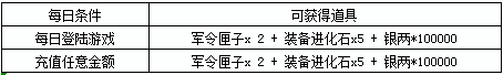 【活动内容】感恩回馈,玩家每日登陆即可免费领一份福利礼包,同时每日充值任意金额,可再领一份福利礼包!