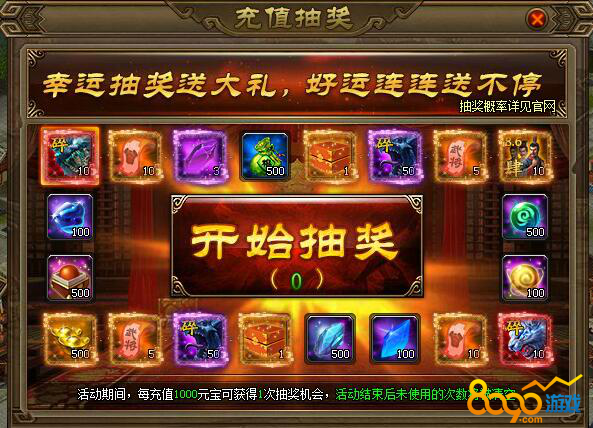 【活动内容】活动期间,玩家每累积充值满1000元宝获得一次抽奖机会,抽奖次数将于活动结束后0点清空。(活动参考UI,具体以游戏中为主)