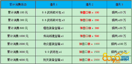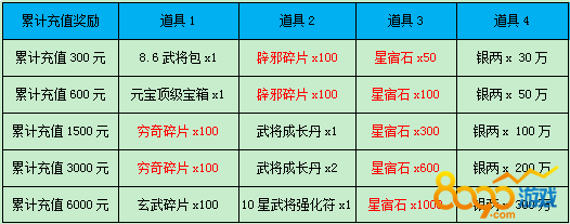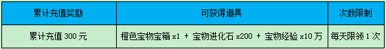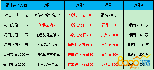 【活动内容】活动期间,每日累计满300元,即可领取一份宝物大礼包,助力主公宝物提升!
