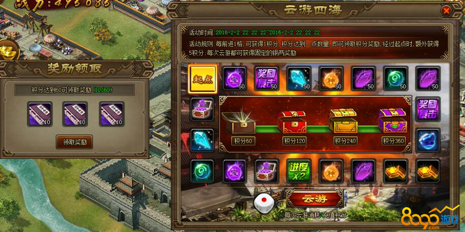 【活动内容】活动期间,每消耗100元宝获得一次云游机会,玩家每前进一格,即可获得一个云游积分,积分达到一定数量,即可领取积分奖励,经过起点时候额外获得5积分奖励,每次云游都可获得固定的银两奖励!(活动参考UI,具体以游戏中为主)