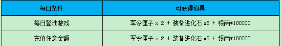 【活动内容】感恩回馈,玩家每日登陆即可免费领一份福利礼包,同时每日充值任意金额,可再领一份福利礼包!