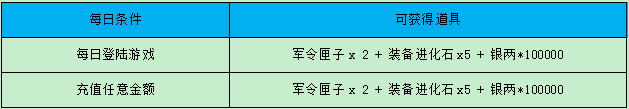【活动内容】感恩回馈,玩家每日登陆即可免费领一份福利礼包,同时每日充值任意金额,可再领一份福利礼包!