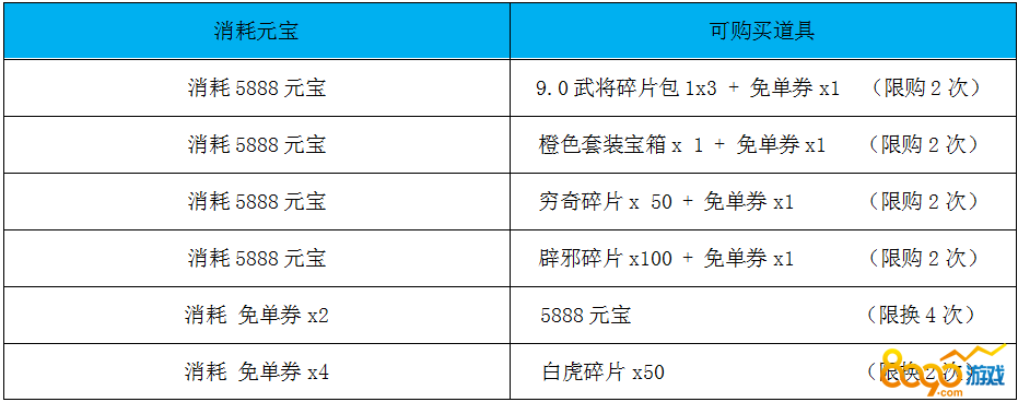 1) 9.0武将碎片包1:关羽碎片x10、周瑜碎片x10、司马懿碎片x10、吕布碎片x10四选一