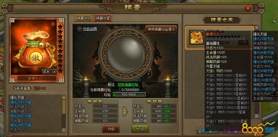 2. 锦囊升级可增加自身属性值,当锦囊升级到一定等级时,会激活天赋。