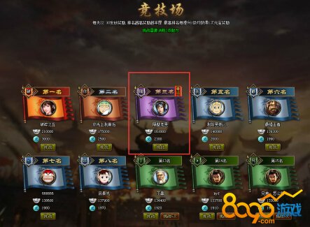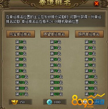 4. 在幸运排名位置的主公在发放排行奖励时,可额外获得一份幸运排名奖励,幸运排名会在每天24:00随机刷新位置
