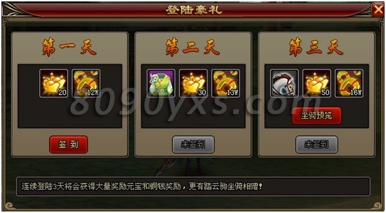 每个账号首次进入游戏,每天登陆游戏签到后都可获得YB和铜钱奖励。每日一次,总共可以领取3次;第3次签到还有坐骑踏云驹相送。