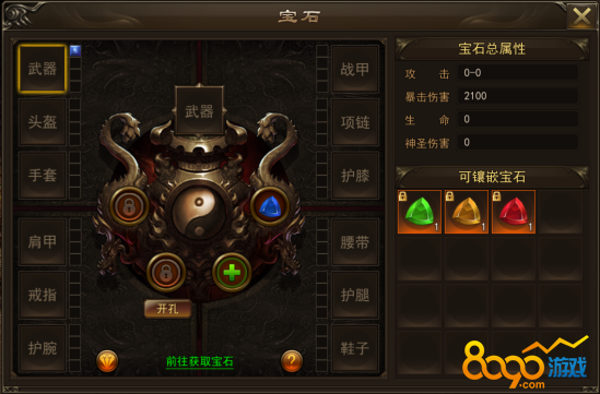 宝石分为4种宝石分别增加不同的属性,每种宝石对应可镶嵌的部位,宝石镶嵌可更换装备