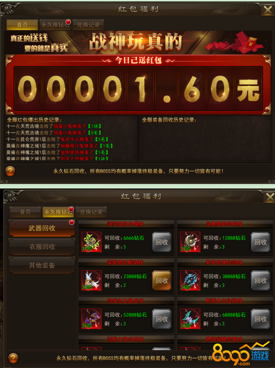 8090神将的钻石福利是开服后开始的活动,前三天回收单件装备,玩家击杀任意BOSS都有几率获得顶级装备,装备等阶越高,回收获得的钻石也越多