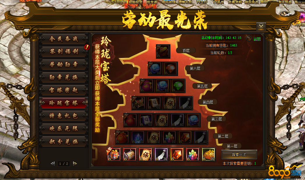 活动内容:参与宝塔密匙获得钥匙,点击前往,可在玲珑宝塔内开启奖励!