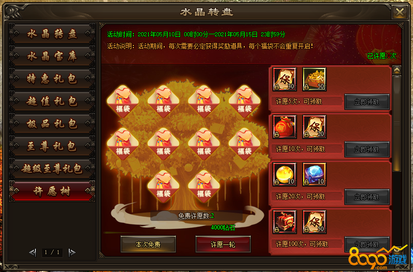活动内容:活动期间,每次需要必定获得奖励道具,每个福袋不会重复开启!许愿一轮为10次!