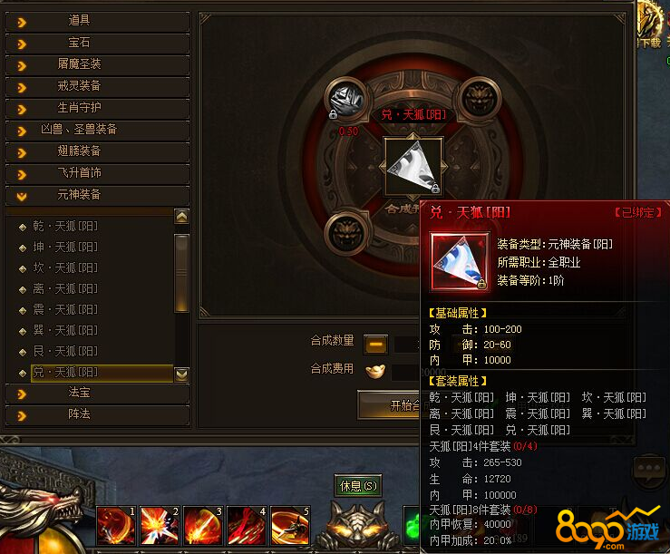 在神戒中天狐【阳】元神装备是最低阶级的一套元神装备,而且这套装备也只能佩戴在阳类的元神装备界面里。天狐【阳】元神装备共有8个不同部位,分别是乾·天狐[阳]、坤·天狐[阳]、震·天狐[阳]、巽·天狐[阳]、坎·天狐[阳]、离·天狐[阳]、艮·天狐[阳]、兑·天狐[阳]。这8件天狐【阳】元神装备部位的属性效果都是一样的,可以为玩家增加100-200攻击、20-60防御、10000内甲。玩家身上佩戴套元神装备,套装件数达到4件,可激活265-530攻击、12720生命、100000内甲的套装属性;集齐8件套装可获得内甲恢复40000、20%内甲加成的套装属性。玩家要想获得这套元神装备,可以通过击杀元神BOSS,会有一定几率掉落获得。或者在寻宝的过程中,也有一定几率获得的。大家还能去收集元神结晶的材料,来合成天狐【阳】元神装备,各个部位合成需要消耗50个元神结晶的。