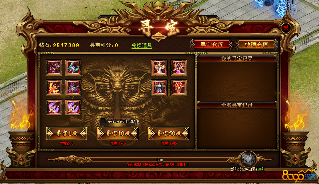 通过寻宝有几率获得各职业的极品装备、特殊装备、等珍贵道具。