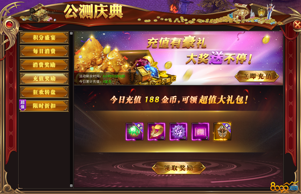 【活动内容】活动期间,每日充值金币到达指定数额,将获得海量奖励。充值信息每日重置。