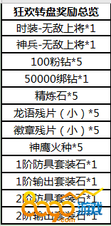 【活动内容】活动期间,消耗狂欢令牌即可在转盘进行抽奖,抽奖有几率获时装和神兵等绝版奖励。抽奖所得积分可直接在积分商城兑换奖励。