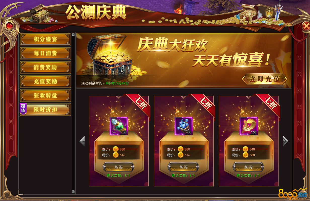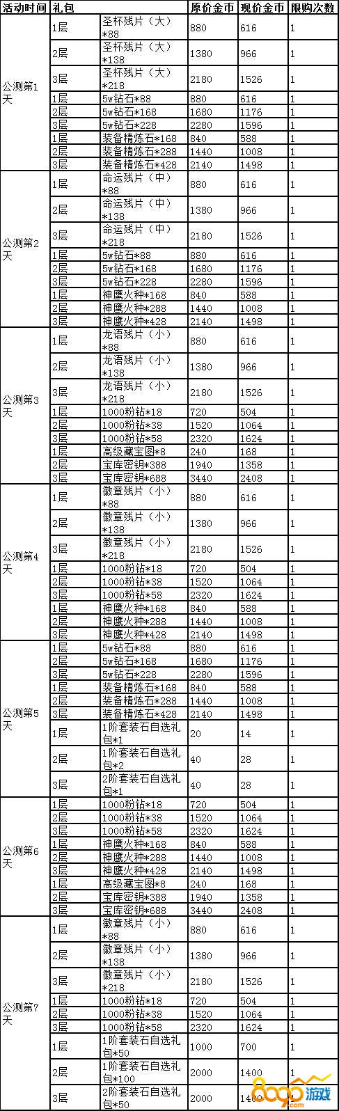 【活动内容】活动期间,每日都会有不同的材料钻石等折扣礼包出售,礼包共三层,购买后即可继续购买下一层。每日出售的折扣商品有所不同,不可错过哦。