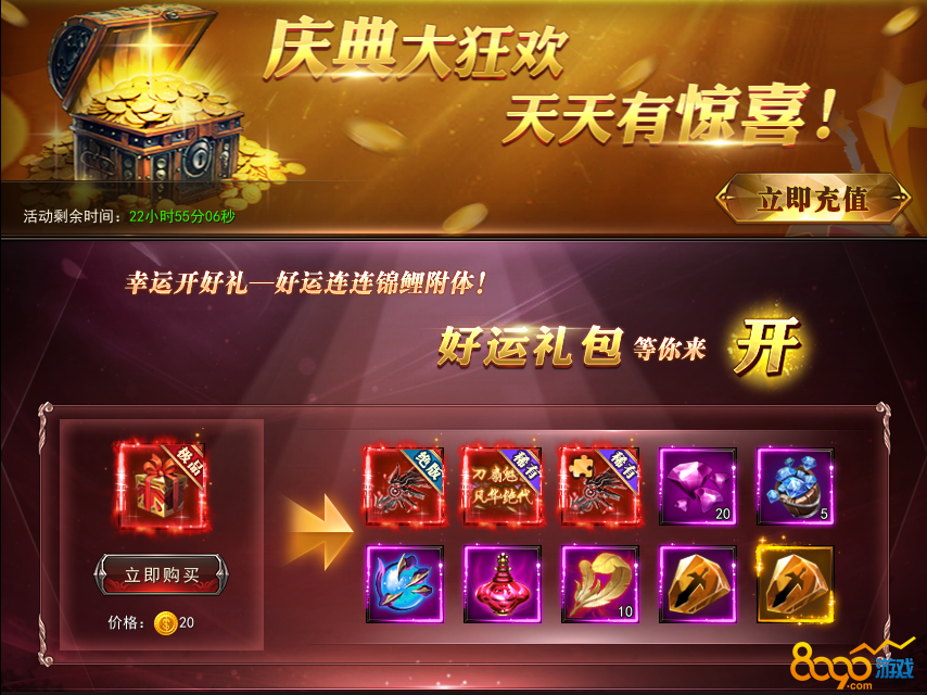 活动方式:20金币1份的幸运礼包,可随机开出1件超超超超值道具,快来试试手气吧!