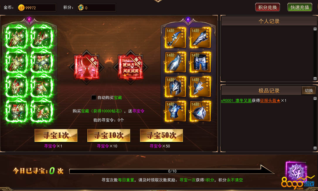 4. 寻宝一次获得1积分,积分永不清空,可在界面右上角的积分兑换里兑换道具。