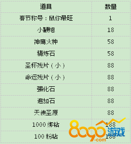 春节时装-龙飞凤舞、春节称号-瑞鼠迎春来、坐骑皮肤-圣诞恋歌、稀有称号-招财进宝、100粉钻、50000绑钻、精炼石、龙语残片(小)、徽章残片(小)、神鹰火种