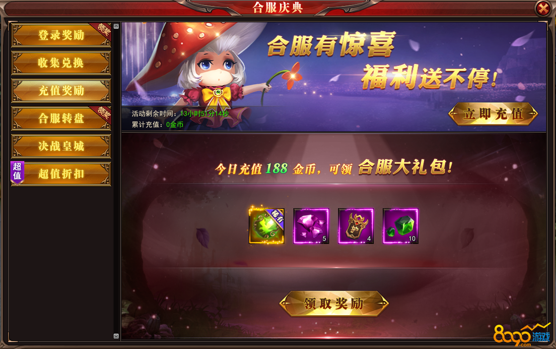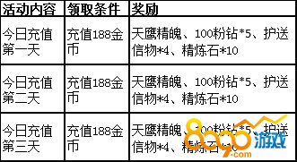 【活动内容】合服开服后3天内,每日充值188金币,即可每日领取合服大礼包!3天充3次,领取3次。