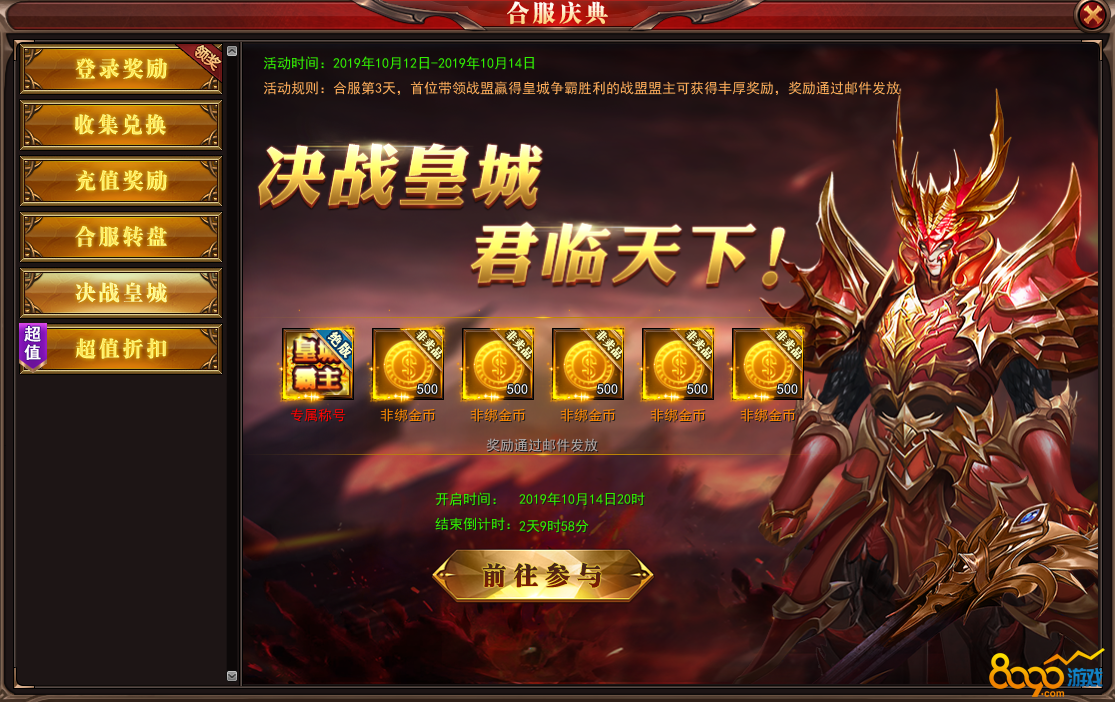 3、清空决战皇城数据,合服后第一次决战皇城获胜将获得大量金币奖励。