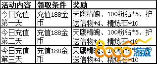 【活动内容】合服开服后3天内,每日充值188金币,即可每日领取合服大礼包!3天充3次,领取3次。