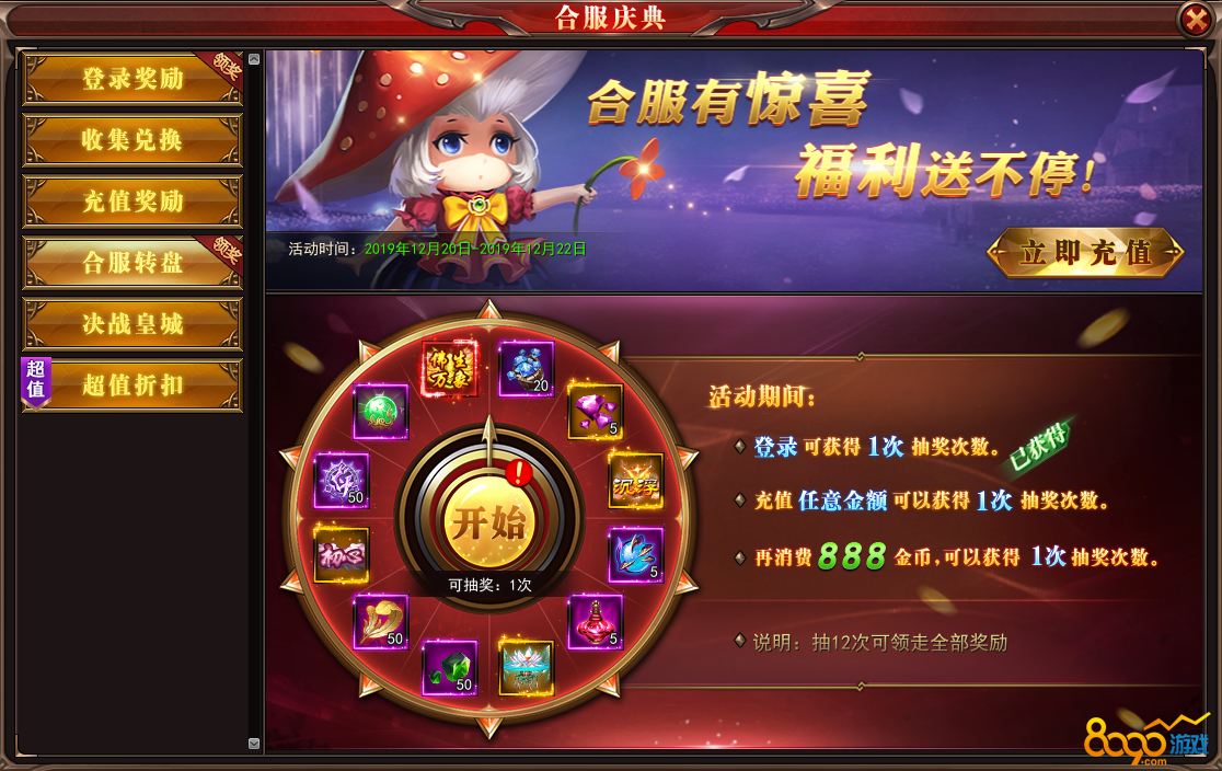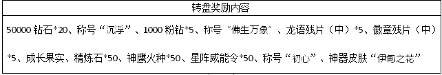 【活动内容】:活动期间,玩家可进行抽奖,登录游戏即可获得1次抽奖次数,充值任意金额即可获得1次抽奖次数,之后每次消费一定数量金币均可获得1次抽奖次数,12次抽奖后可领走全部奖励。