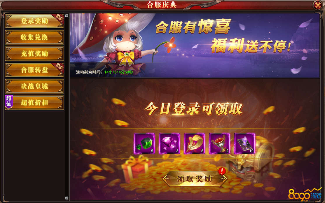 【活动内容】合服开服之后,玩家每日登录都可领取丰富的奖励,直至累计登录3天,共可领取3次奖励