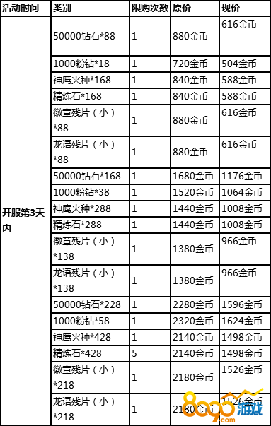 【活动内容】合服开服后3天内,开放超值折扣,在3天内物品达到购买次数上限后即不可再次购买。