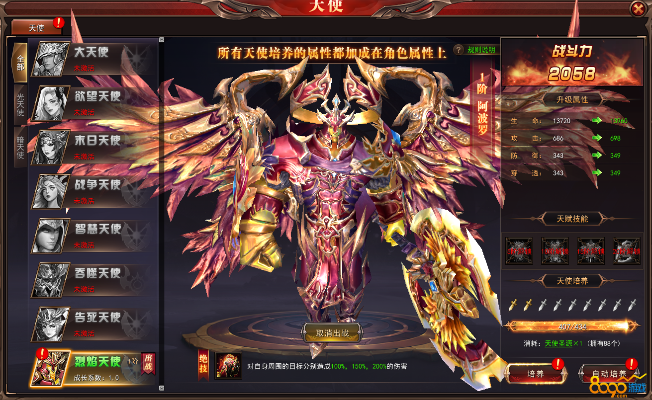 获得天使后,玩家可以使用天使圣源进行进阶突破。进阶后可以开启对应天使的天赋技能,增加玩家基础属性。每个天使的绝技与天赋技能都不相同,玩家可以根据自身的喜好来升级搭配。