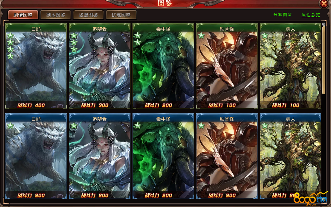 神座的图鉴系统是提升战力的好地方,分为剧情图鉴、副本图鉴。战盟图鉴以及试练图鉴。每种图鉴又分为五种怪物,每种怪物又分为五种级别,从低到高分别是绿、蓝、紫、橙、红。
