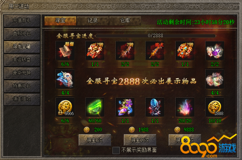 活动说明 : 活动期间,全服寻宝2888次,必出展示物品!高级转生武器衣服、高品质印记,等你来抢!