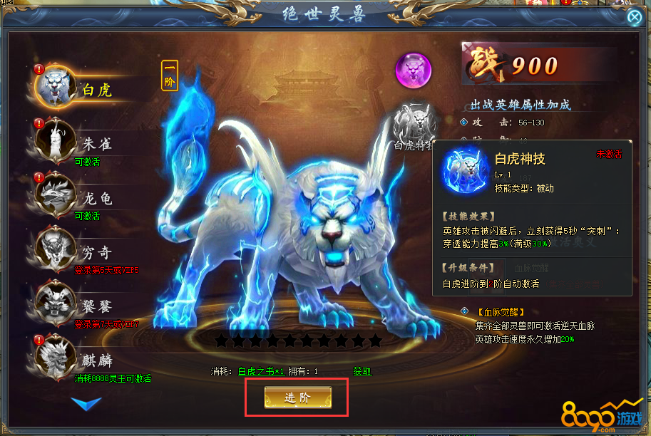 通过消耗道具可对已激活的灵兽进阶,进一步提升灵兽的加成属性。