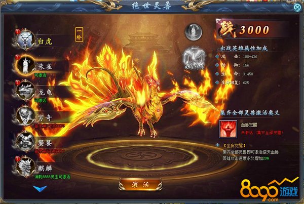 满足激活条件,或消耗灵玉可激活激活绝世灵兽。立即获得激活属性,激活全部灵兽后,金额激活奥义。永久提升英雄攻击速度。