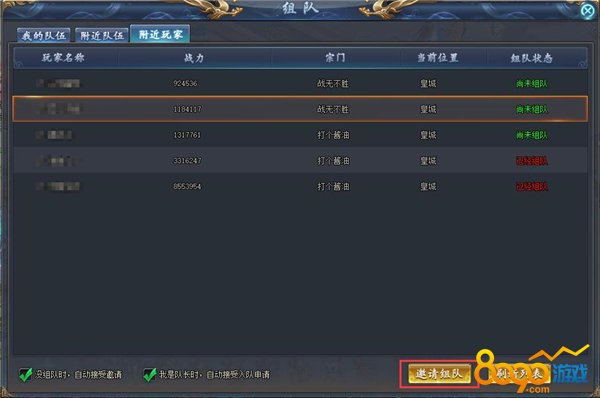 在组队界面下方,可以看到2个选项。该选项在勾选之后,当我没有入队或我是队长时,别人的组队邀请或入队邀请将被自动同意,只要队伍有足够位置就会被自动邀请入队。
