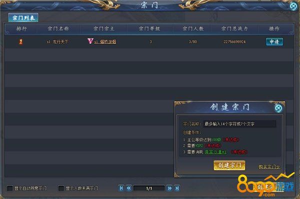 玩家未加入宗门时,点击“宗门”图标可查看宗门列表,可选择创建宗门或者加入宗门。