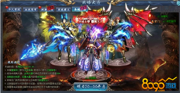 其次通过【战场大厅】-“圣域争霸“可打开界面,本服皇城宗门参与圣域争霸,其他宗门参与卫城争夺。战场中间有大旗,占领大旗可使成员获取积分时提高50%;击败敌对玩家、采集战场内的水晶均获得战场积分;所有宗门成员获得的积分总和即为阵营积分;达到指定积分可获得积分奖励,活动结束时,还留在战场内的玩家结算阵营排名奖励;