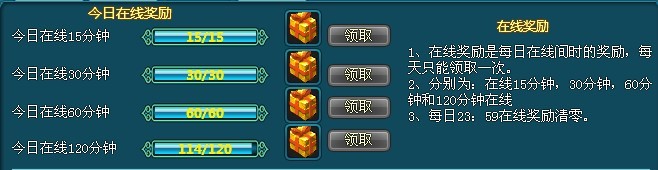 升级快除了做任务,每天的在线奖励也是可以得到大量的经验——在线满15、30、60、120分钟将分别获得一次礼包奖励,内有大量经验。在页面的右上角也会有提示的,请不要忘记领取哦!
