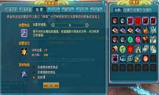 加星可以赋予物品星级效果,给予法宝额外的效果加成,使法宝威力更上一层楼。穿戴加星的物品,可以提升人物能力。装备加星和法宝加星一样,使用同一个加星界面,同一套加星道具。