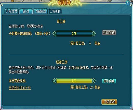 想要让这些变得简单,木有问题,《三界乾坤》满足各位!玩家们都有福啦,在《三界乾坤》商城里特设了“工资区”。在这里,玩家可以使用工资奖金来购买各类实用道具与打造材料。玩家每日获得工资的途径有两种:一是每日在线累积三小时,可获取20奖金;二是通过完成兑奖仙子提供的每日商城体验任务,可获取100奖金。由此,玩家每日可获得总计120奖金的工资奖励。鼠标轻松一点,丰厚奖金就是属于玩家的啦!