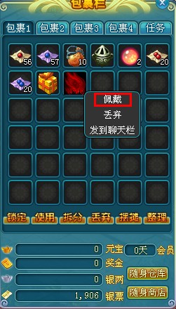 玩家也可以通过点击“包裹”图标,然后点击“宝囊”分页查看自己拥有的法宝。在宝囊中双击法宝或者点击“使用”后再点击法宝,就可以佩戴。