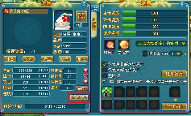 同样想省事的玩家只要等宠物升级后,可以分配点数的时候,点击“推荐配点”,系统就会为您平均分配点数,就可以完成宝宝的点数分配了。