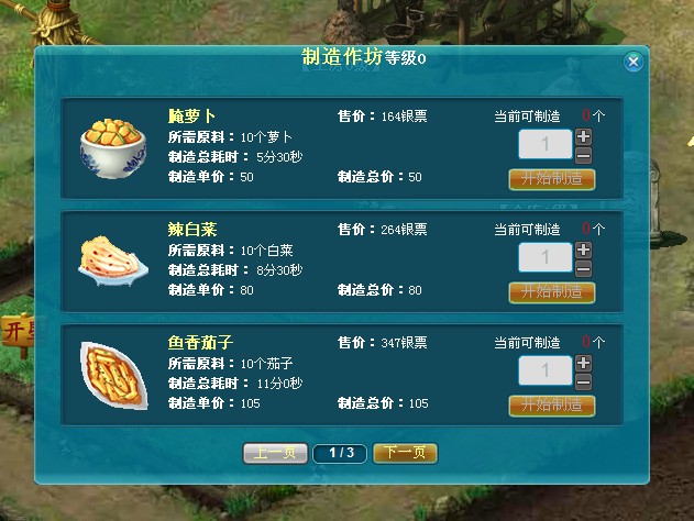 收取的果实不仅能卖钱,还可以制作成各种菜肴,提高货物的价值,加大卖出的价值。准备好制作所需的蔬菜,点击画面右上方的“作坊”按钮,就会出现所谓的菜单,点击其中可以制作的菜肴,开始制造,一盘色香味俱全的佳品就完成了。