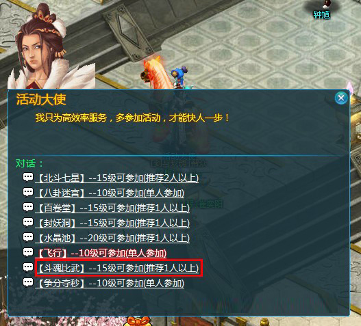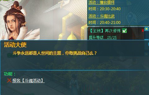 《三界乾坤》斗魂比武是每天的限时活动,每周四、日的每天20:30 -21:00,等级15级以上的玩家就可以来到京都,找到“活动大使”,点击与其对话。