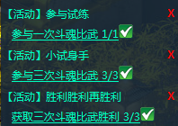 玩家在参加活动时会自动获得3个任务,参与试炼:参与一次斗魂比武、小试身手:参与三次斗魂比武、胜利胜利再胜利:获取三次斗魂比武胜利。