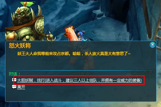 玩家来到妖将的所在地,点击“妖将”与其对话,选择进入战斗,就可以开始挑战了。