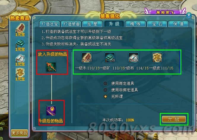 把想要升级的装备或是法宝移动到“放入升级的物品”下的框栏里,“升级后的物品”上的框栏里就会显示出来升级后的物品。玩家可以把鼠标放在“升级后的物品”上的图标处,就会显示升级后物品的各种属性。准备好一级木*15、一级矿*15、一级布*15、一级皮*15,就可以点击“升级”按钮,完成升级。