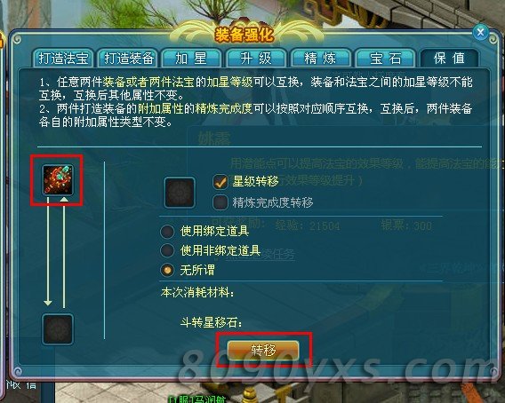 装备强化的最后一个功能——保值。任意两件装备或是两件法宝的加星等级可以互换,装备和法宝之间的加星等级不能互换,互换后其他属性不变。不仅加星等级可以换给高级的装备或是法宝,连精炼完成度也是可以的。