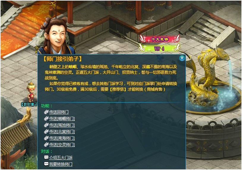 3.Íæ¼Ò¿ÉÒÔͨ¹ýʦÃÅÒý½øµÜ×ӵĶԻ°¿òÁ˽â¿ÉÒÔÑ¡Ôñ×Ô¼ºÏ²»¶µÄʦÃŽøÐаÝʦÃÅ£¬µã»÷ÎÒÒª°Ý¡¾Ñþ³ØÕÆÃÅ¡¿Ê¦ÃÅÖ®ºó×Ô¶¯½øÈëÑþ³ØÊ¦ÃŲ¢µã»÷Íê³ÉÈÎÎñ¡£¼Ì¶ø³ÉΪÁËÑþ³ØÅɵÄÒ»Ô±¡£