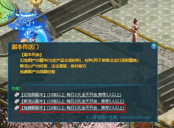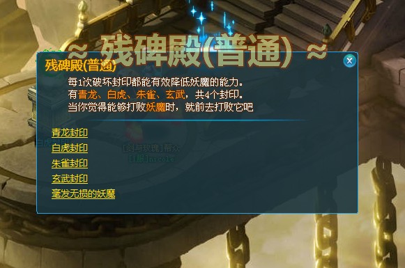 ÒÀ´ÎÏûÃðÇàÁú¡¢°×»¢¡¢Öìȸ¡¢ÐþÎäËÄ´ó·âÓ¡£¬½¨ÒéÍæ¼ÒÁ½ÈË×é¶Ó£¬¶øÇÒÿÌìÖ»ÓÐÒ»´Î»ú»á¡£²Ð±®µî¸±±¾´æÔÚʱ¼äΪ30·ÖÖÓ¡£¸±±¾Ê±¼ä½áÊøºó£¬Íæ¼Ò×Ô¶¯´«Ëͳö¸±±¾¡£²Ð±®µî¸±±¾³ýÁ˲ú³ö¸ß¶îµÄ¾ÑéÖ®Í⣬ҲÊÇ»ñµÃʦÃÅ·¨±¦´ú±ÒµÄΨһ;¾¶¡£